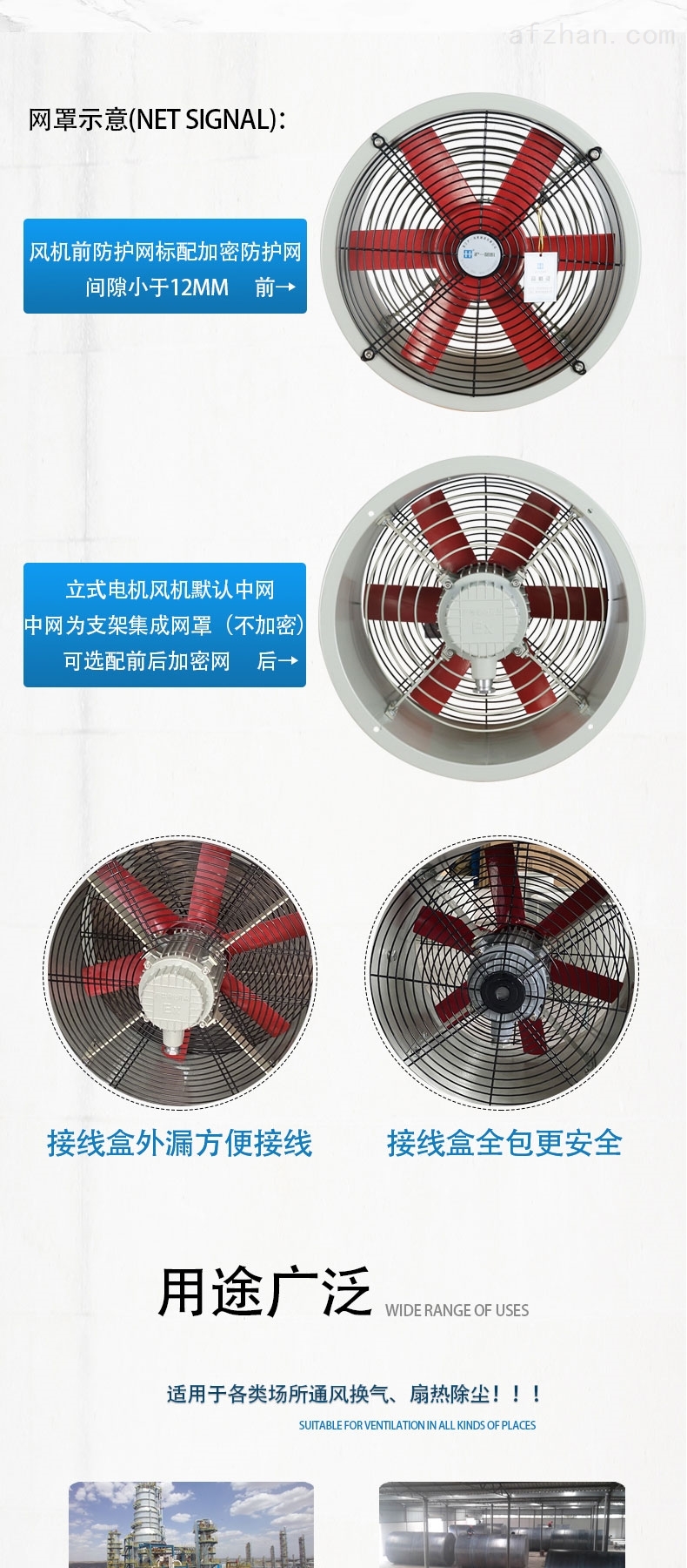 适用与输送易燃易爆无腐蚀性气体,环境温度不得超过60℃,广泛应用于一般工厂、仓库、办公室、住宅内通风换气或强暖气散热,也可有较长的排气管道内间隔串联安装,以提高管道中的压力,卸下电机可做自由风扇。防腐轴流式风机(FT35-11型),采用防腐材料外涂环氧漆加工而成,电机采用特种防腐电机用于输送有腐蚀性气体。用于输送易燃易爆的气体。